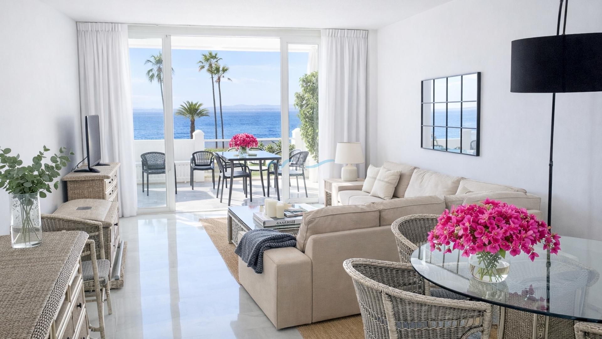 Apartment with open sea views and west-facing orientation, allowing guests to enjoy pleasant winter afternoons and beautiful sunsets from a privileged position. The property has benefited from selected improvements aimed at enhancing comfort. The bathrooms feature walk-in showers, and double-glazed enclosures have been installed in both the living room and the master bedroom, improving insulation and efficiency. The master bedroom has been updated in terms of décor, including wallpaper, a new headboard and lighting. The guest bedroom is fitted with new furniture, with a modern and functional design. The terrace is equipped with modern outdoor furniture in graphite tones, including a built-in bench with cushions, two sun loungers and additional chairs, allowing the dining table to seat up to six guests. The apartment has been recently painted, the floors have been polished, and it is equipped with new crockery, glassware and cutlery, providing a well-presented and practical setting for a comfortable stay. .